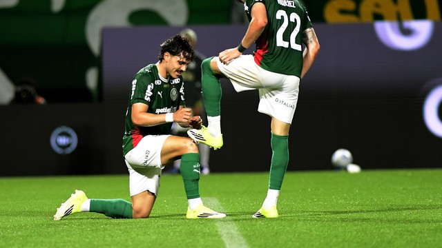 | Mauricio lustra a chuteira de Piquerez depois de gol do Palmeiras (Foto: Marcos Ribolli) |